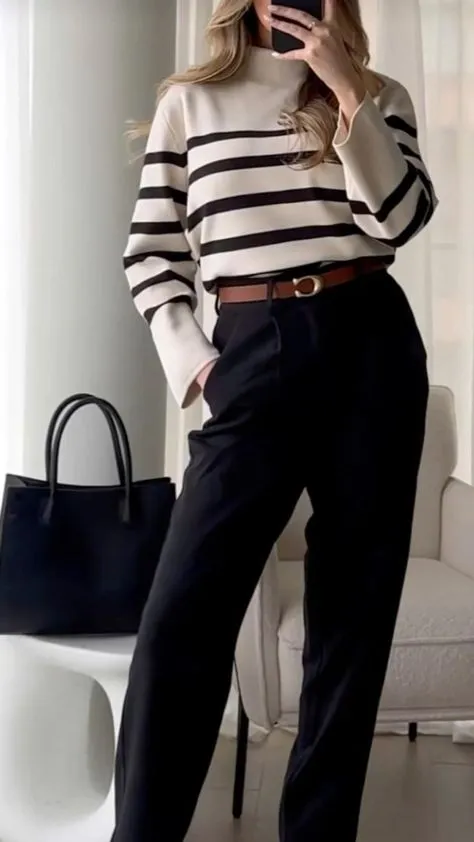 A casual striped sweater paired with black pants provides a relaxed yet professional look for interviews. The stripes deliver visual appeal, while the black pants maintain a refined impression. This combination is ideal for a laid-back yet well-coordinated appearance.