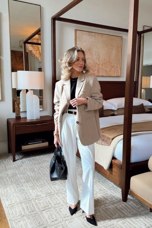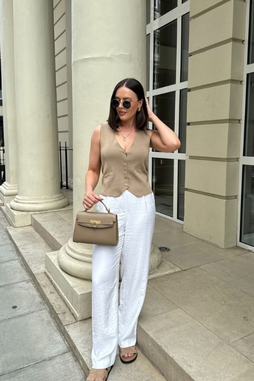 9. Beige Cardigan with White Trousers