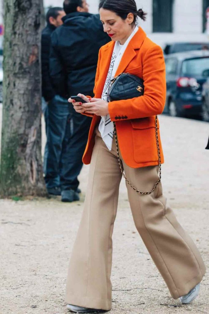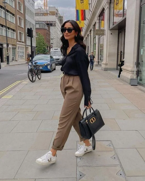 A bright green blouse paired with neutral beige trousers presents a fashionable and eye-catching interview outfit. The green blouse injects a burst of color and personality, while the beige trousers offer a sophisticated balance to the look. This outfit ensures you capture attention in a professional environment.