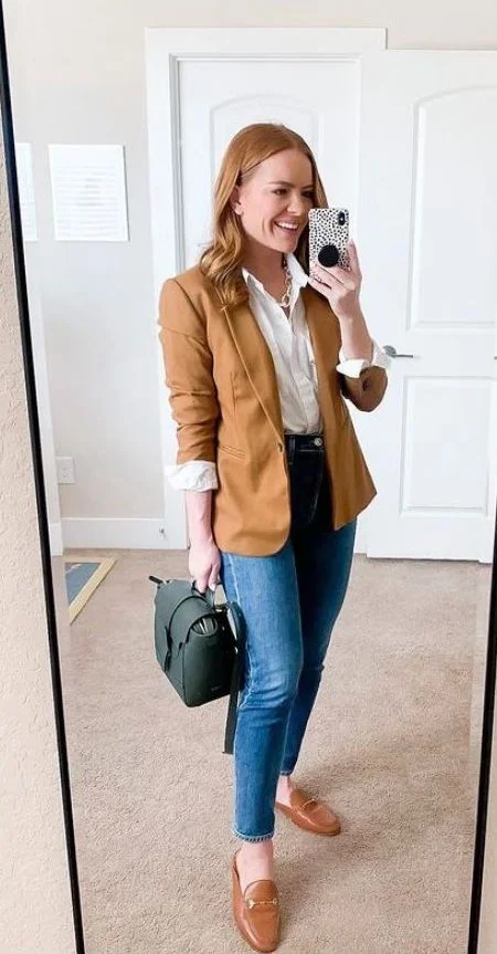 A camel sweater paired with a pleated midi skirt creates an elegant and sophisticated interview attire. The camel sweater brings warmth and grace, while the pleated midi skirt offers a classic and refined appearance. This outfit is ideal for a professional yet stylish look.