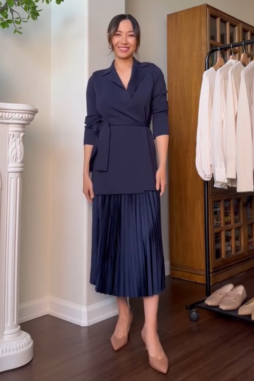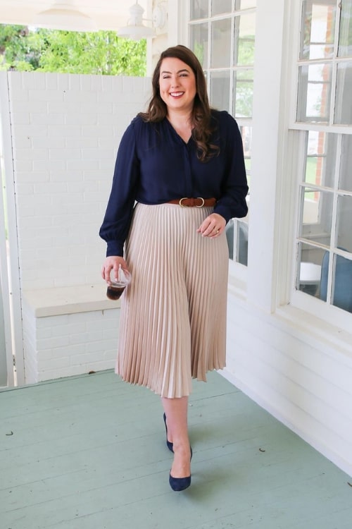An elegant blouse paired with a pleated midi skirt creates a refined and sophisticated interview outfit. The blouse offers a polished, professional appearance, while the skirt adds a hint of grace and style. This combination assures you present yourself with both confidence and elegance.