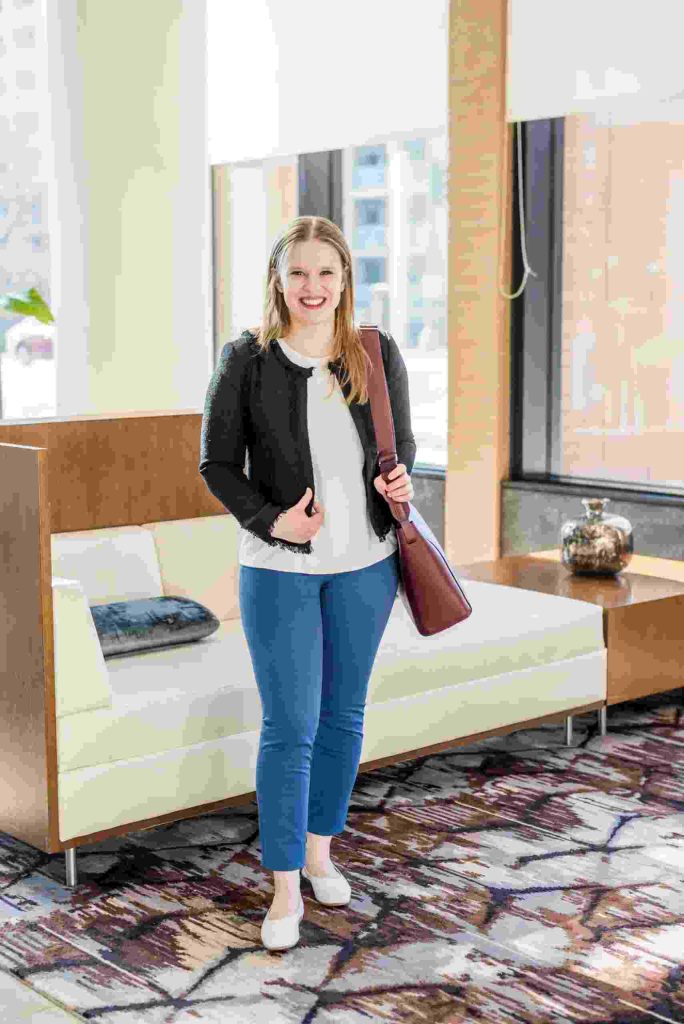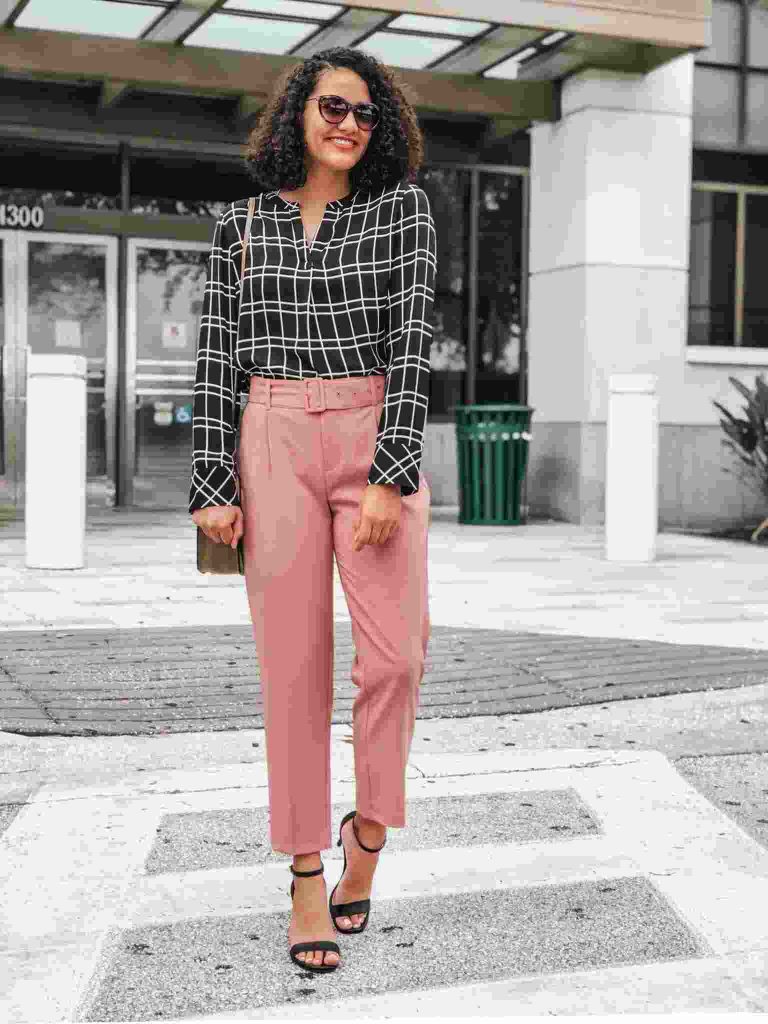A patterned blouse with black ankle pants creates a lively and refined outfit for interviews. The blouse’s patterns add a distinctive element, while the black ankle trousers keep a classic and professional tone. This ensemble is perfect for making a lasting impression.