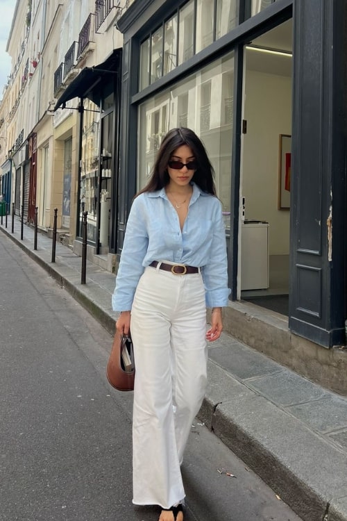 4. Light Blue Linen Shirt and Cream Trousers