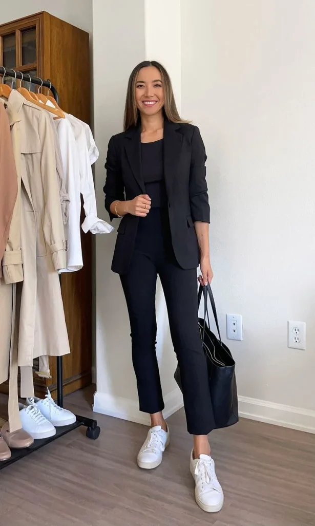 A stylish cropped blazer with black slacks results in a trendy and sophisticated interview outfit. The cropped blazer adds a modern twist, while the black slacks provide a timeless and polished foundation. This pairing is perfect for a sharp, professional appearance.