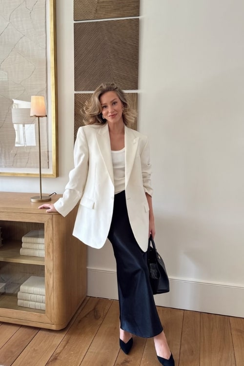 An ivory blazer combined with black culottes forms a stylish and modern interview outfit. The ivory blazer introduces an element of sophistication, while the black culottes provide an updated and professional look. This combination guarantees a chic and polished appearance.