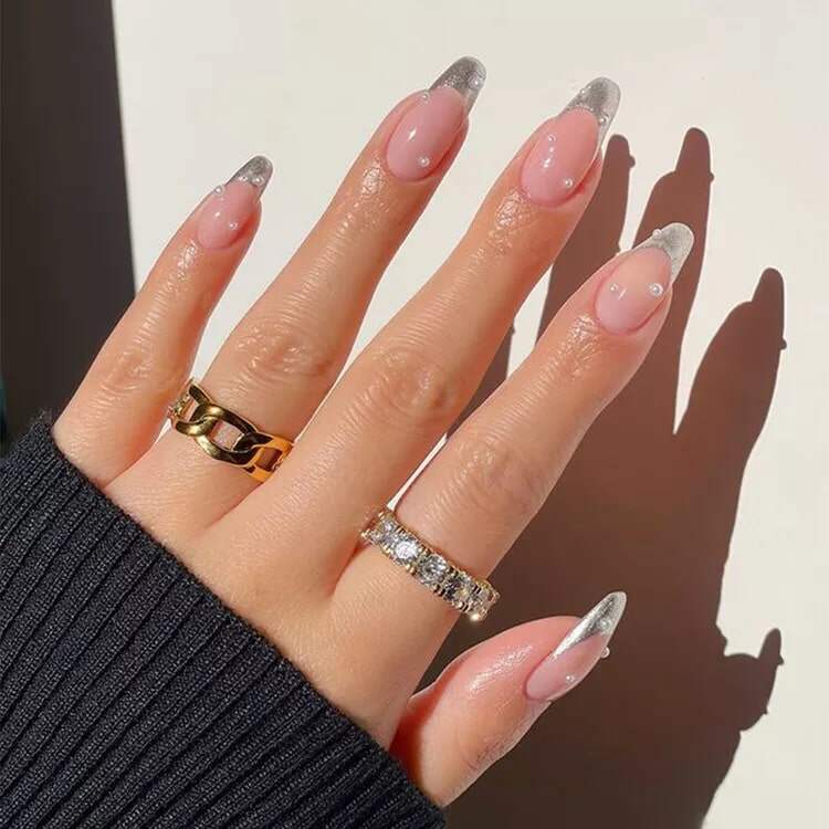 Silver & Pink nails unite soft rose tones with sparkling silver for a refined and feminine appearance. This silver nail design is perfect for weddings, brunches, or any occasion that calls for a hint of sophistication. The gentle contrast forms a harmonious, ethereal feel.