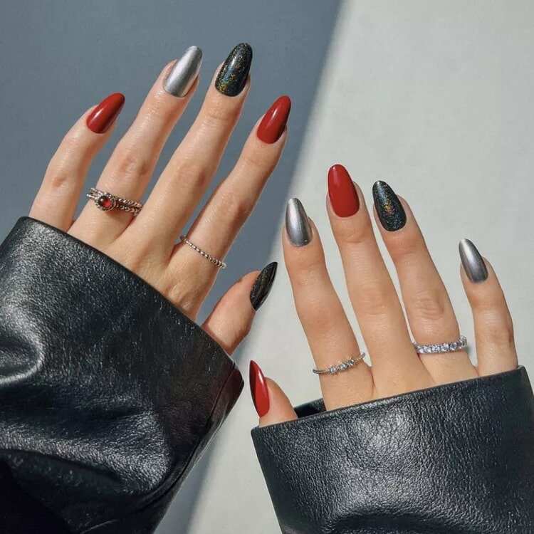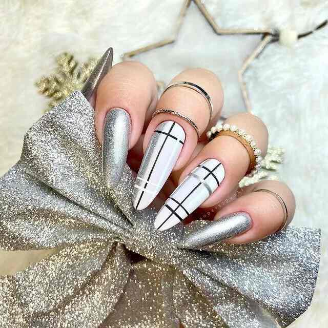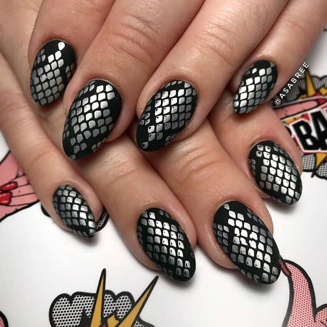 Black and silver scales offer a striking, textured appearance influenced by dragon scales or fish skin. This daring silver nail design features contrasting colors for a dramatic effect. Ideal for making a statement, it’s a must-explore for enthusiasts of bold nail art.