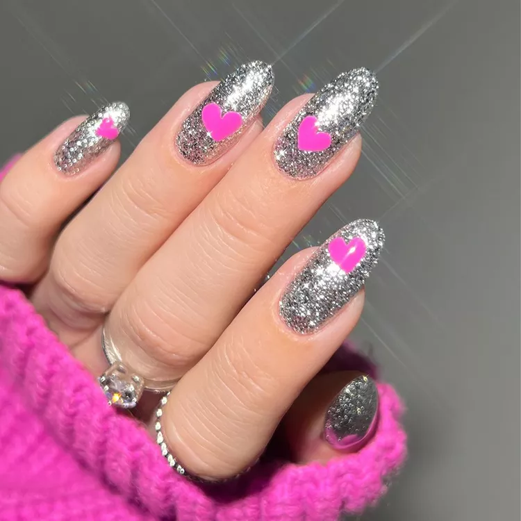 Silver glitter accents bring a brilliant touch to your nails, producing a sparkling visual that reflects light beautifully. This silver nail design harmonizes perfectly with any base color for a versatile, glamorous appearance. Whether for a night out or a celebratory event, glitter accents will have your nails glimmering.