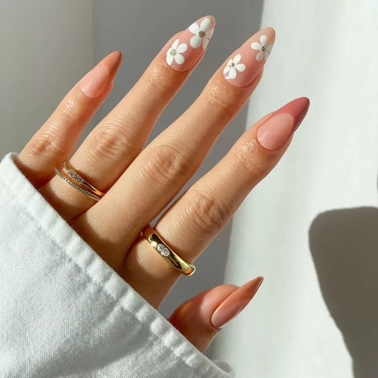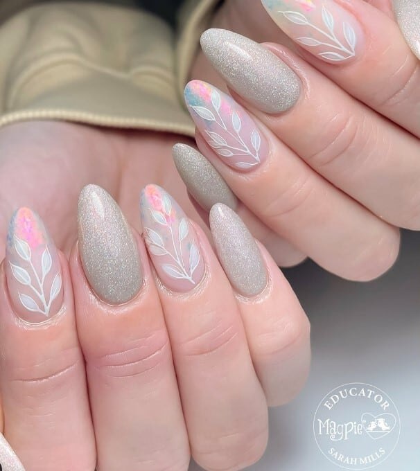 Silver, White, and Nude Daisy Nails showcase delicate daisy motifs accented with silver on a nude base. This silver nail design is excellent for spring or summer, presenting a fanciful and rejuvenating ambience. The charming florals add a touch of nature-inspired allure to your look.