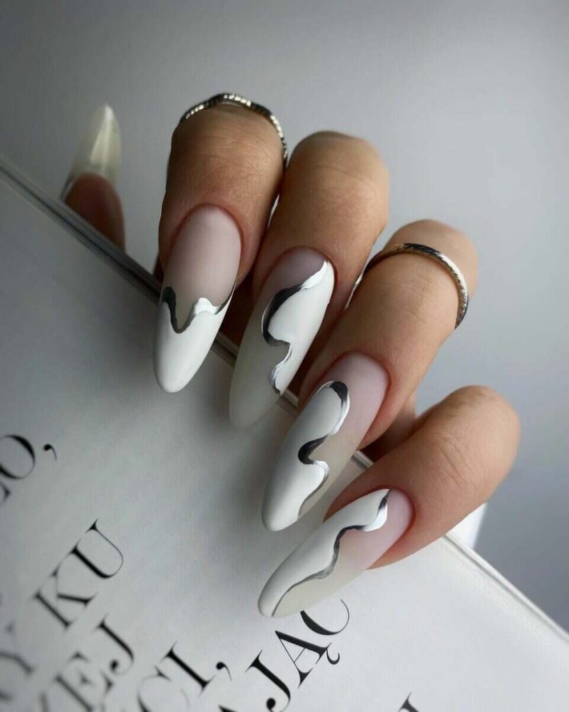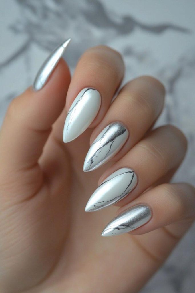 Silver and white marble nails radiate luxury with their intricate patterns that imitate polished stone. This silver nail design merges elegance and creativity, making it a beloved choice for upscale events. The marbled effect is excellent for anyone desiring a distinctive and refined style.