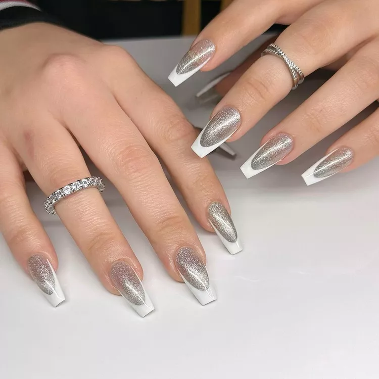 Silver and White French Tip Nails merge sleek silver tips with a pristine white base for a refreshing and tidy aesthetic. This silver nail style is both adaptable and refined, making it a superb selection for any ensemble or occasion. The combination of shades creates a stylish, enduring appearance.