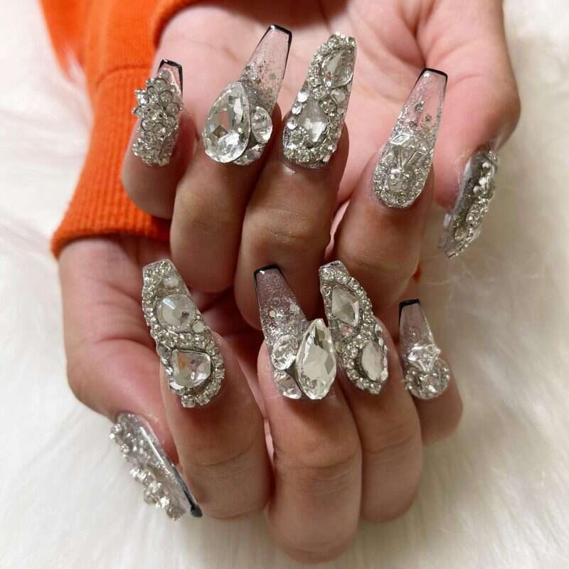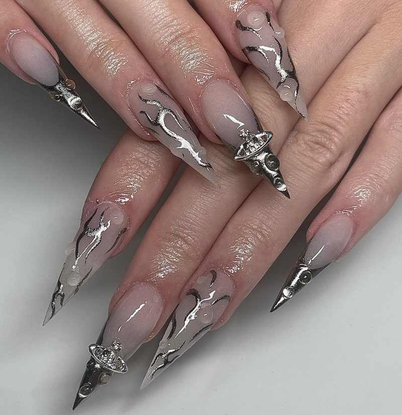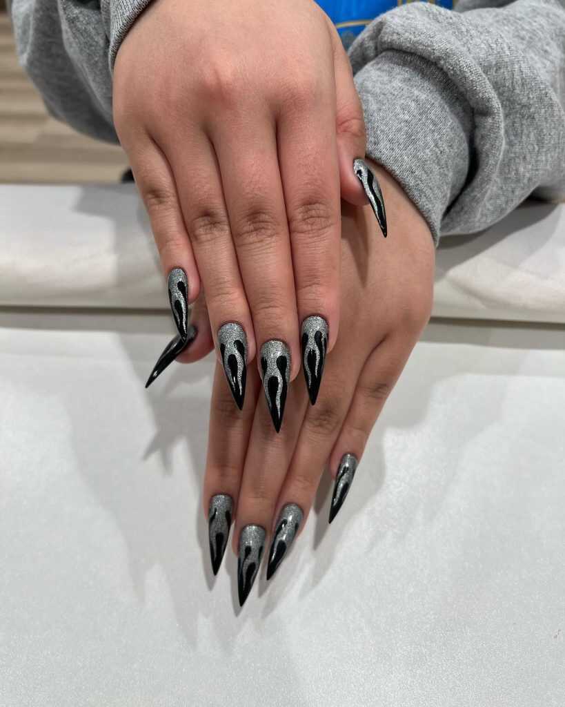 Black Stiletto Nails combined with silver flame nail art produce a bold, daring aesthetic that is hard to overlook. The sharp nail design contrasts beautifully with the shimmering flames, rendering this silver nail creation ideal for a bold and theatrical style. Perfect for nights out or attention-grabbing events.