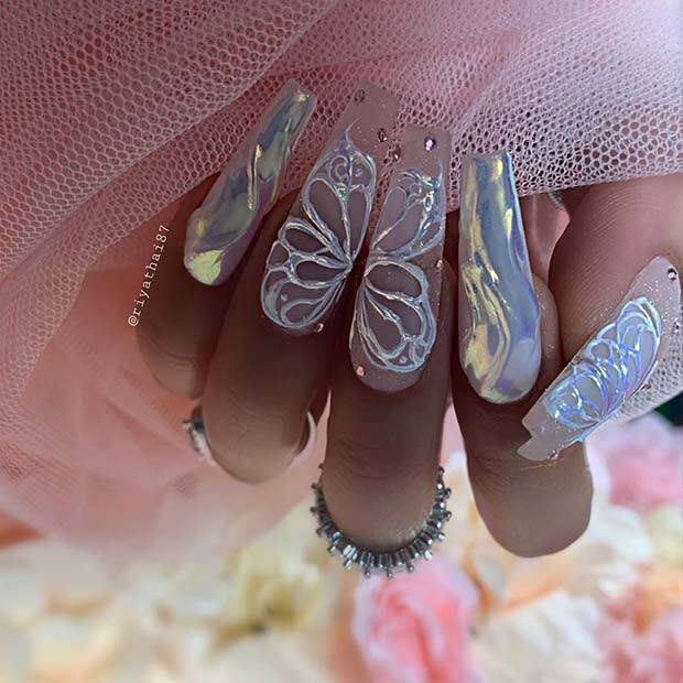 Beautiful Butterfly Nails display intricate silver butterfly designs over a neutral or pastel base. This silver nail fashion is whimsical and refined, ideal for infusing your manicure with a hint of nature-inspired beauty. The sparkling details make the butterflies appear vibrant.