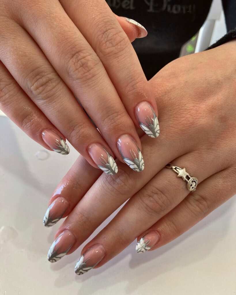 Silver Butterfly Patterns on Nude Tips showcase intricate butterfly motifs adorned with a metallic silver coat on a nude base. This silver nail design is understated yet elegant, perfect for individuals desiring a subtle hint of glamour. It’s ideal for spring or special events.