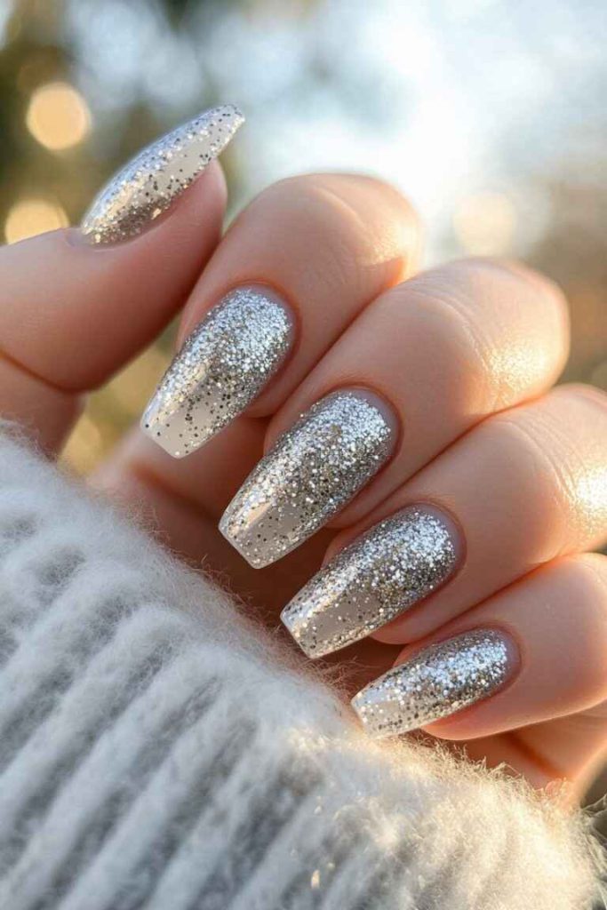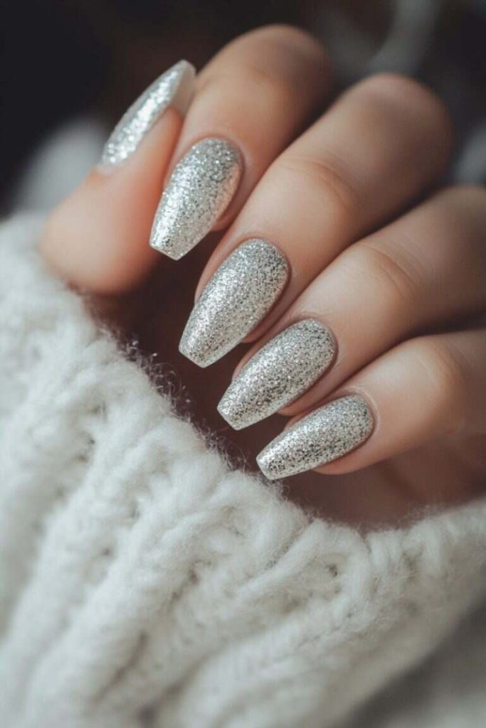 Silver Sparkles nails embody the charm of winter with glimmering silver flakes on a clear or white base. This silver nail design is perfect for the festive season, offering a snowy, dreamy aesthetic. Whether for celebrations or intimate gatherings, these nails bring winter wonderland sensations to your fingertips.