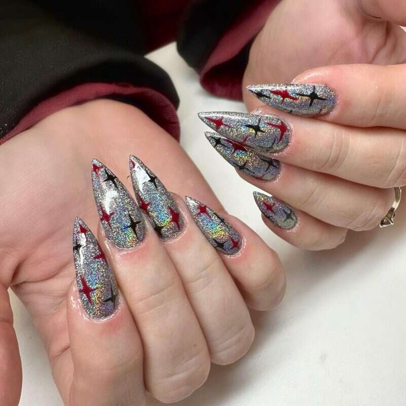 Black and Red Stars on Radiant Nails produce a celestial-themed design with striking contrast. The dark stars stand out against the metallic silver backdrop, making this silver nail design ideal for anyone desiring a distinctive, edgy appearance. It’s a bold choice for lovers of daring styles.