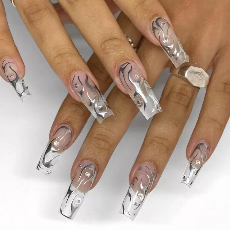 Chilly flame creations merge frosty silver shades with blazing patterns for a daring yet cool appearance. The silver flames produce an attention-grabbing effect, rendering this design suitable for winter or standout occasions. This silver nail style perfectly intertwines audaciousness and sophistication.