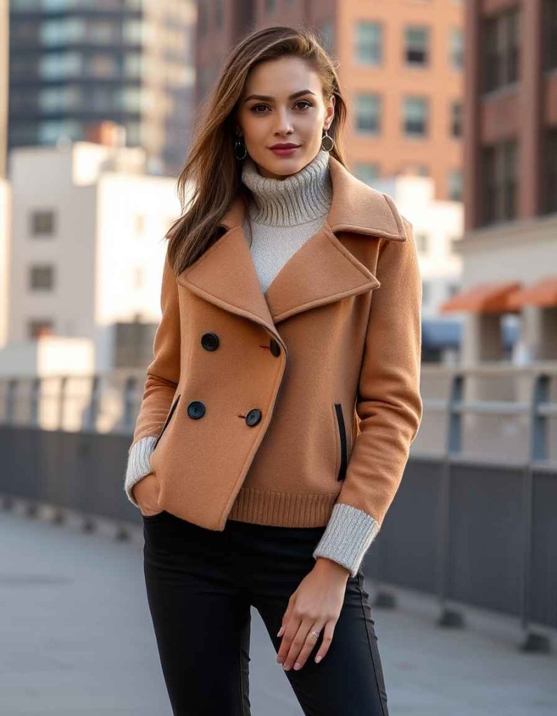 Peacoat-inspired winter sweaters combine the warmth of knitwear with the structure of a coat. These tailored garments provide a refined look for winter excursions. Combine them with sleek boots for a sophisticated, weather-ready outfit.