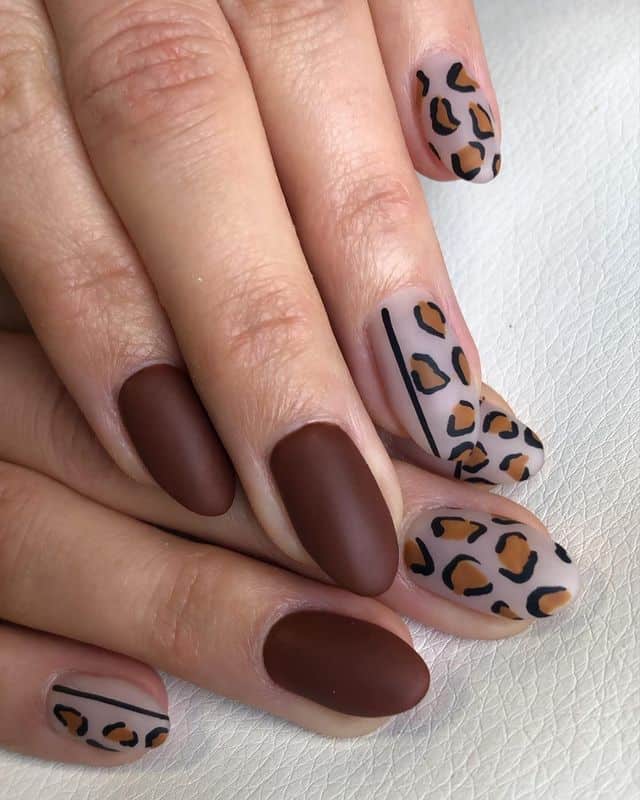 Leopard Matte nails merge fierce animal patterns with a fall matte finish. This daring design introduces a hint of wild elegance to your autumn manicure, making it perfect for standing out. Embrace the season with a fashionable and bold nail style.