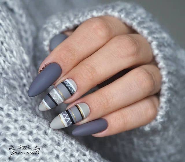 Grey Patterns fall matte nails feature detailed designs on a muted grey foundation. This fashionable ensemble introduces a contemporary touch to your autumn manicure. The matte finish amplifies the refined appearance, making it suitable for both casual and formal events.