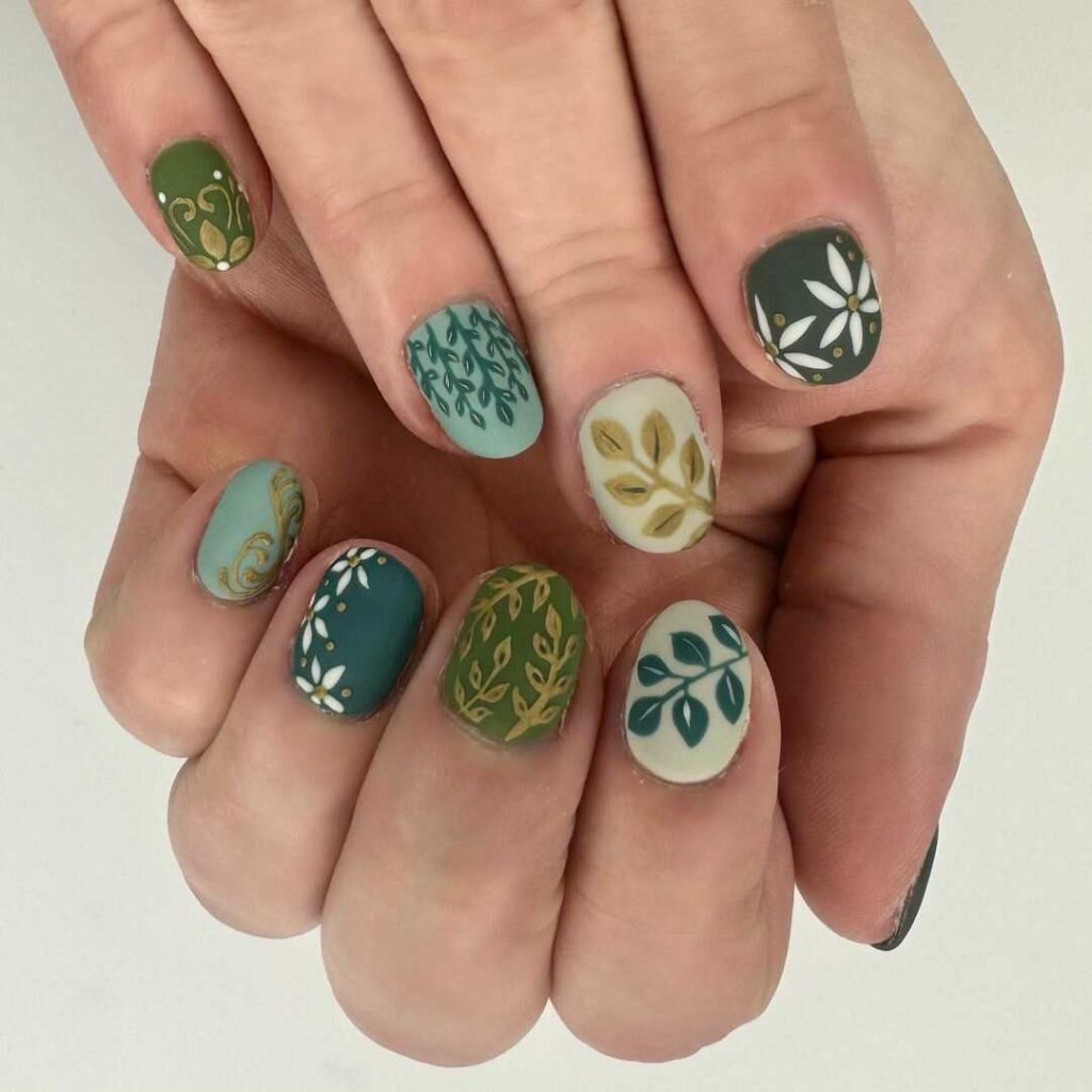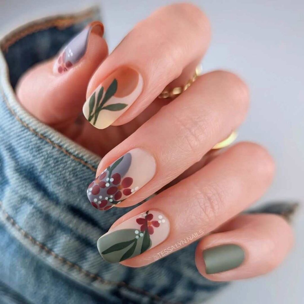 Natural Botanical Art fall matte nails exhibit detailed botanical patterns on a subdued, earthy background. This graceful design captures the spirit of fall with its organic elegance and stylish matte finish. Perfect for infusing a bit of nature into your seasonal aesthetic.