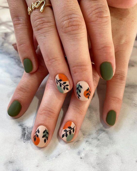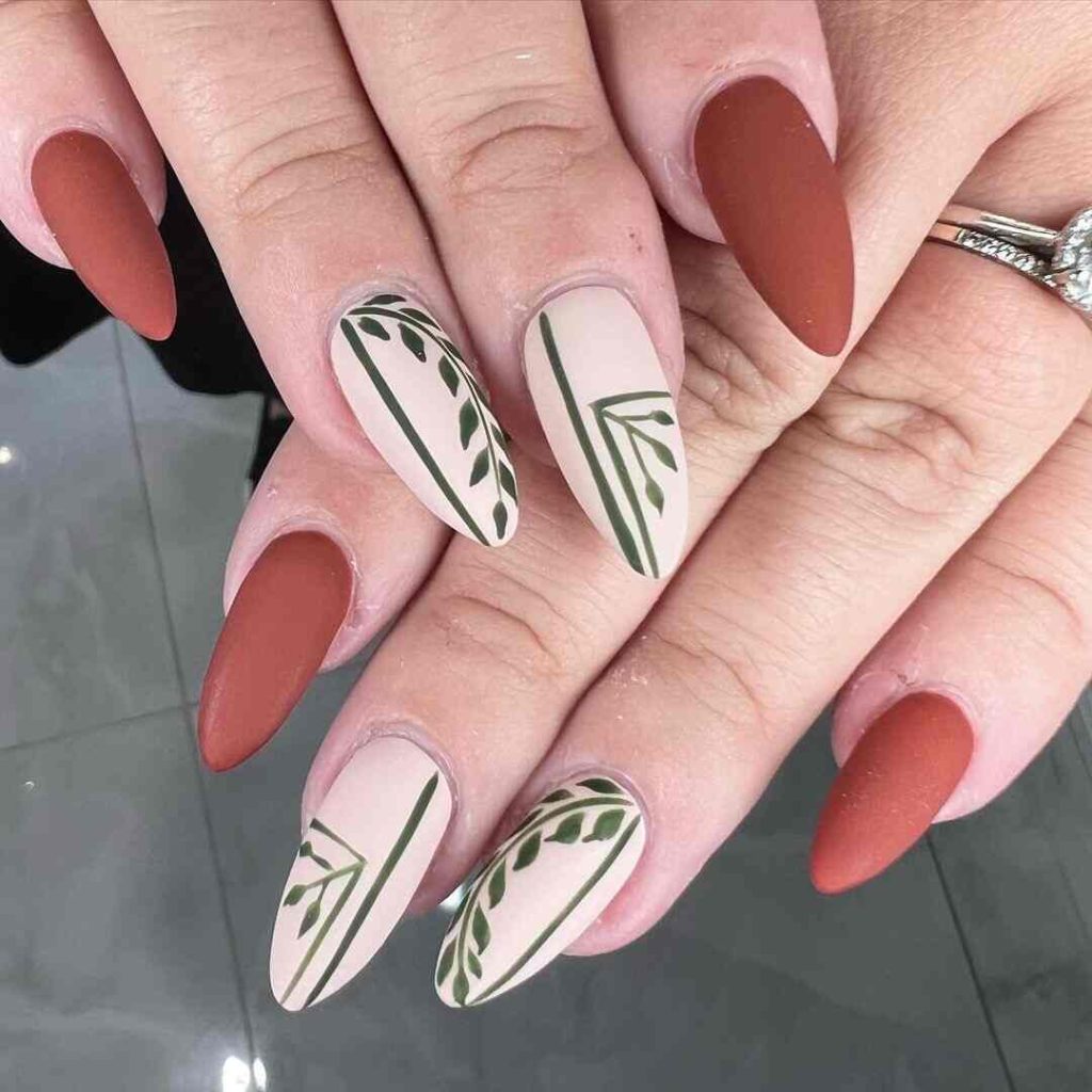 Matte Rust with Green Leaf Accents nails present a deep, rusty shade enhanced by understated green leaf embellishments. This design, inspired by autumn, merges natural tones with a stylish matte finish, making it ideal for celebrating the season’s organic beauty.