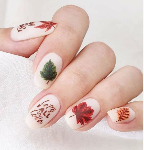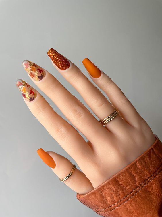 Fall Leaf Accents fall matte nails merge deep autumn tones with intricate leaf designs. The matte finish amplifies the seasonal appeal of this manicure, ideal for honoring the beauty of autumn with an added touch of elegance.