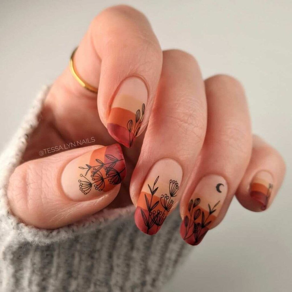 Autumn Gradient with Floral Accents nails showcase a seamless gradient of warm autumnal shades decorated with intricate floral details. This design infuses a sense of grace and seasonal allure into your manicure, making it suitable for any fall celebration.