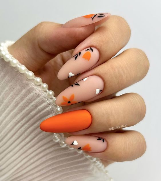 Bold and Bright Orange Florals fall matte nails highlight vibrant orange flowers set against a matte foundation. This striking design injects a splash of color and seasonal charm into your manicure, perfect for showcasing autumn with flair.