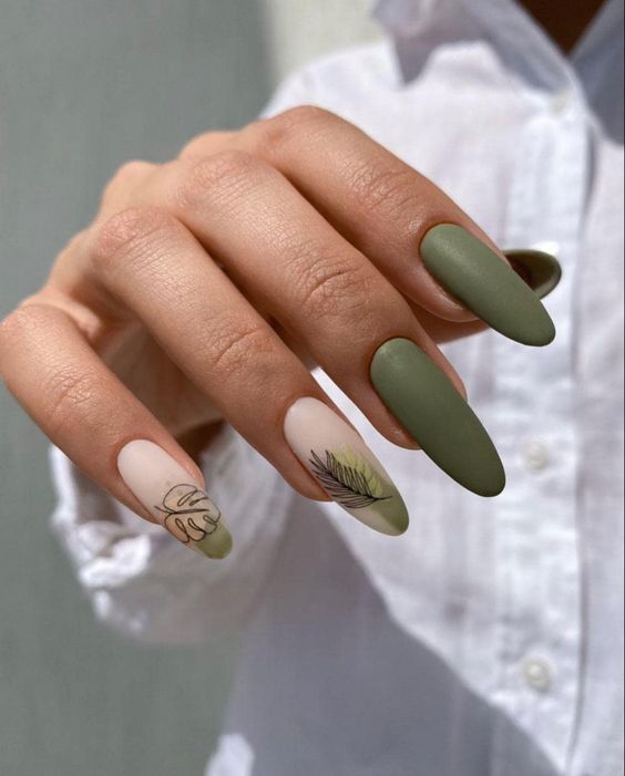 Bold Green Accents fall matte nails present striking green embellishments against a neutral matte backdrop. This design introduces a seasonal pop of color while preserving an elegant, understated aesthetic. Perfect for individuals who appreciate a touch of daring in their fall manicure.