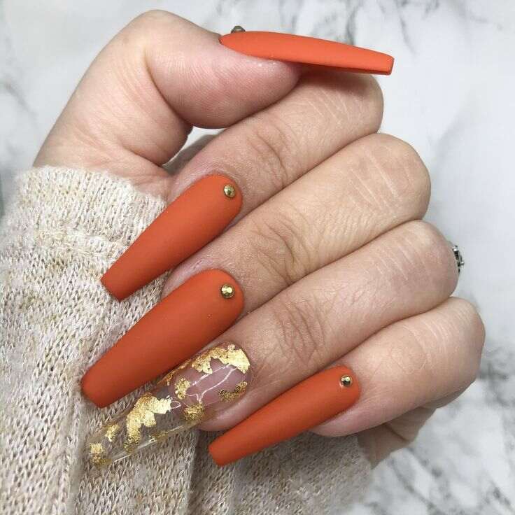 Charred Orange fall matte nails encapsulate the spirit of autumn leaves with a warm, muted shade. This matte finish evokes a rustic appeal to the classic orange color, making it a fantastic choice for any fall occasion or informal outing. Welcome the season with this lively tone.
