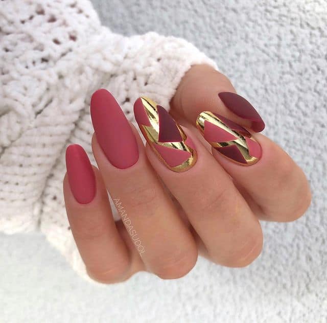 Geometric Nail Design featuring fall matte colors merges striking shapes with seasonal tones. This creation delivers a stylish, modern appeal characterized by its crisp lines and subdued shades. Ideal for individuals who enjoy incorporating a contemporary spin into their autumn nail art.
