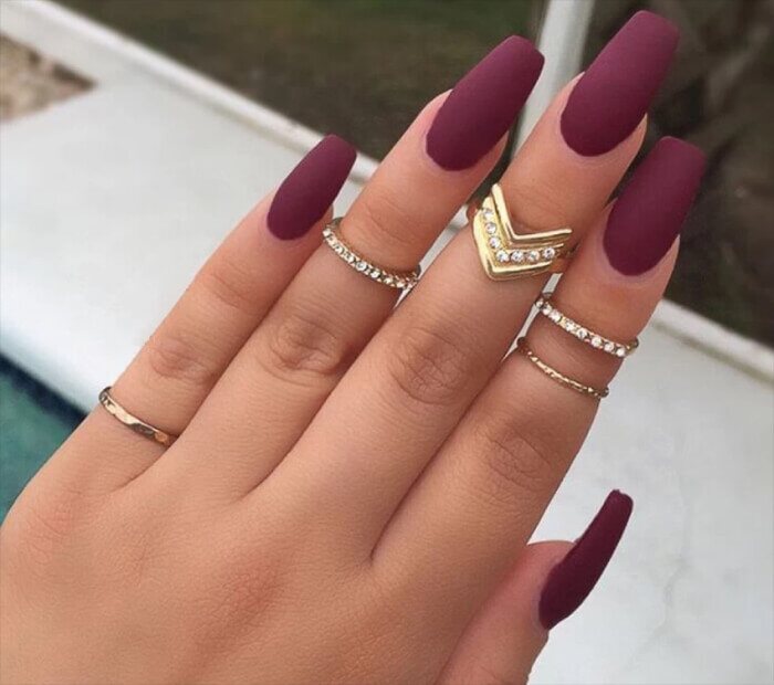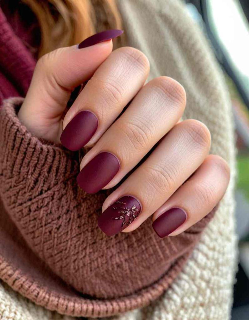 Matte burgundy nails represent a daring yet sophisticated selection for Fall Wedding Nails For Guests. The soft texture enhances the opulence of the shade, making it perfect for autumnal festivities. Pair with golden accessories or highlights for an opulent finish.