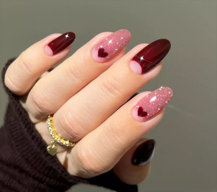 Nails inspired by Valentine’s Day lend a romantic essence to Fall Wedding Nails For Guests. Envision soft reds, pinks, and intricate heart motifs that subtly enhance wedding themes. Perfect for autumn occasions, this style encapsulates love and warmth in every aspect.