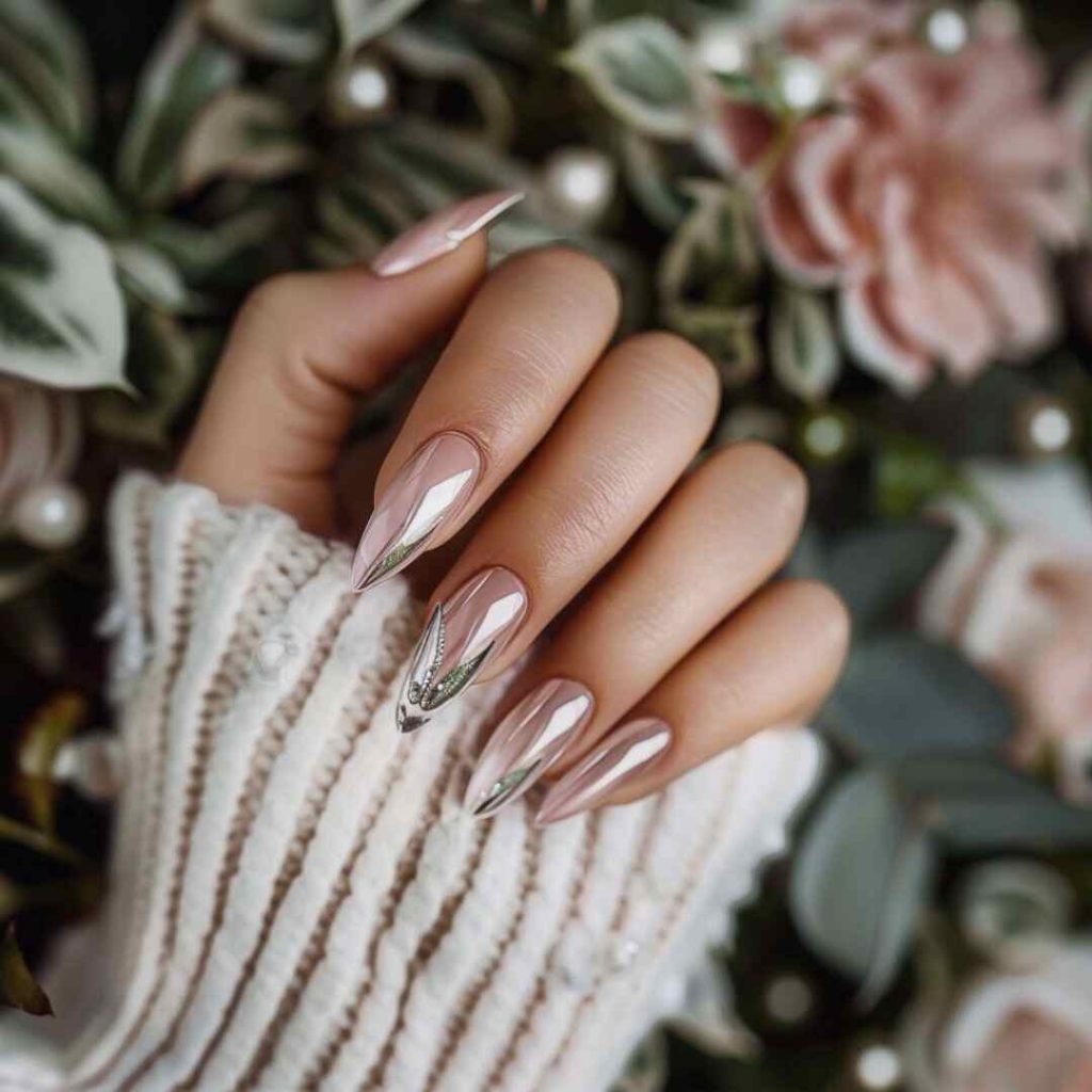 Nude nails embellished with slight twists, such as diagonal lines or fine metallic details, provide subtle elegance for Fall Wedding Nails For Guests. This design harmonizes simplicity with innovation, making it appropriate for both minimalist and glamorous ensembles. Incorporate a shiny finish for an extra touch of refinement.
