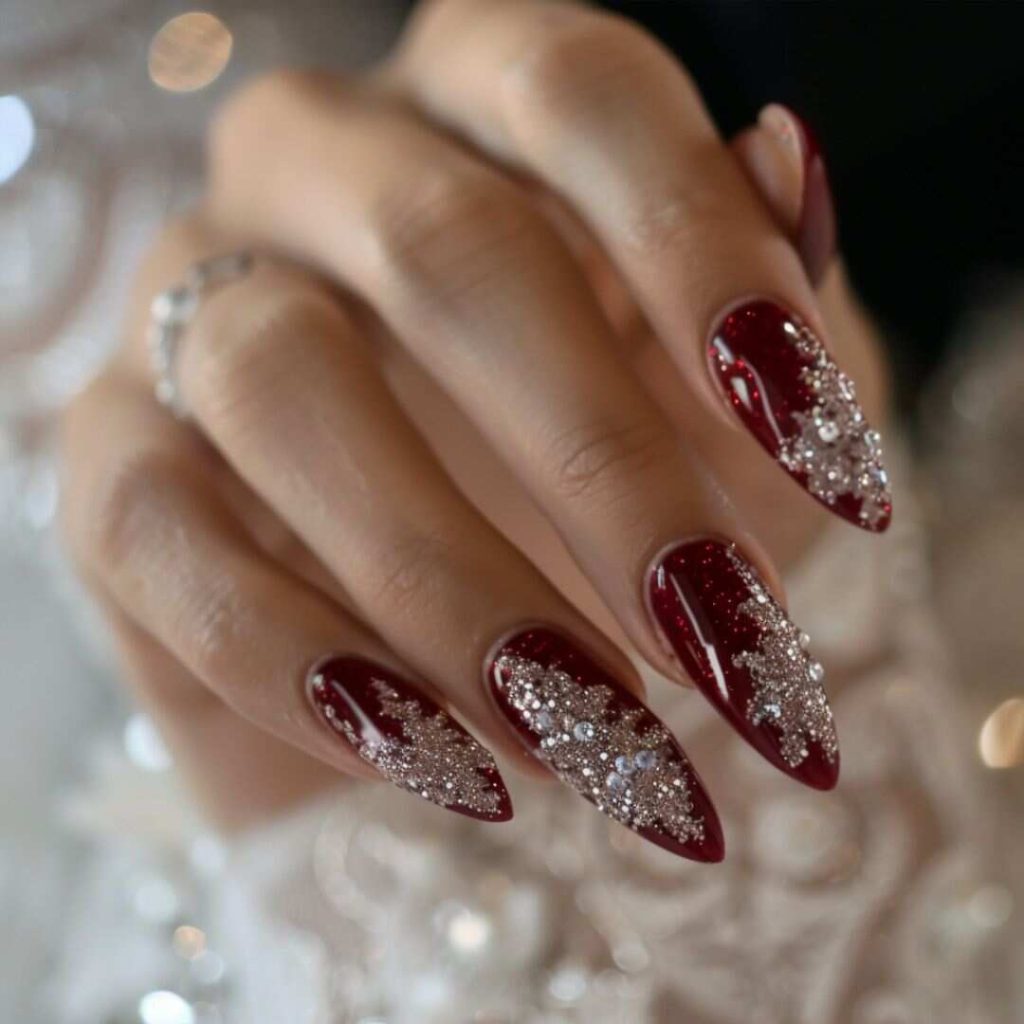 Silver and blue nails adorned with glittery tips are an impressive option for Fall Wedding Nails For Guests. This design fuses cool shades with sparkle, creating a frosty yet sophisticated impression. Perfect for evening receptions, this manicure brings a hint of glamour to autumn celebrations.
