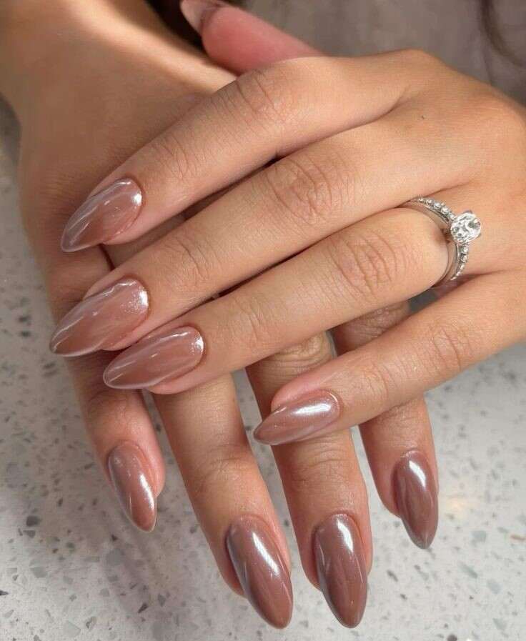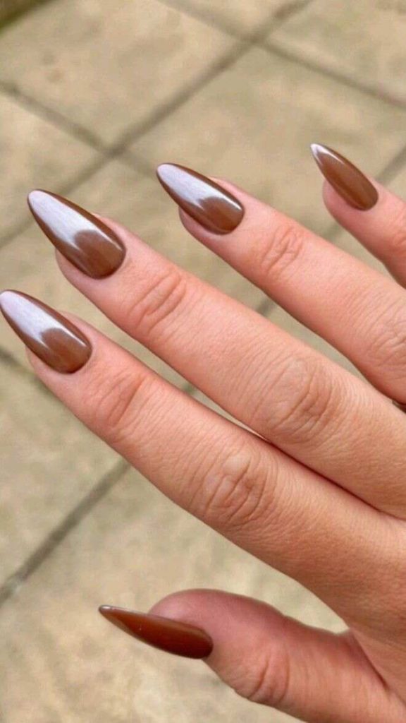 Brown chrome nails bring a trendy, bold interpretation to Fall Wedding Nails For Guests. The metallic sheen provides depth and brilliance, making it perfect for glamorous fall festivities. Complement this sleek appearance with earthy or jewel-toned outfits for a coordinated autumn vibe.