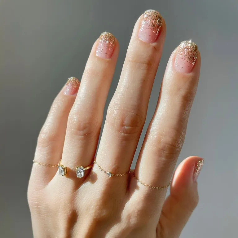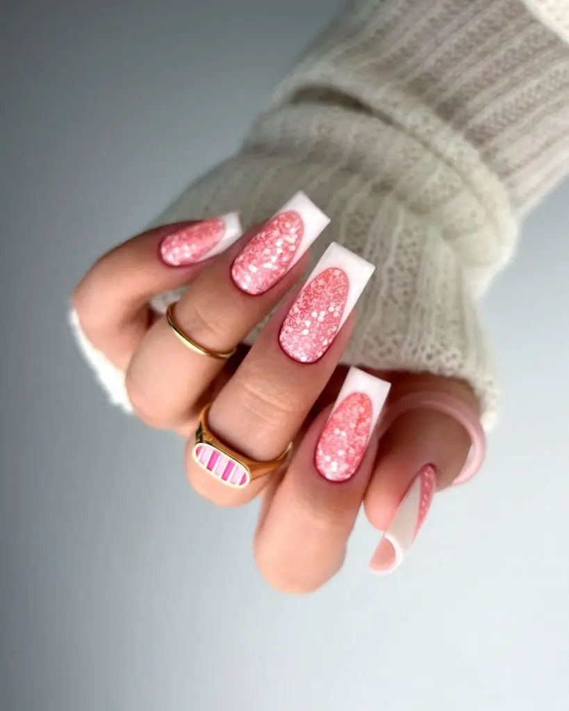 Glittery pink square-shaped nails merge sparkle and form for Fall Wedding Nails For Guests. This stylish design mixes soft pink shades with sparkling glitter for a harmonious, festive appearance. The square silhouette lends a modern touch, ideal for contemporary weddings.