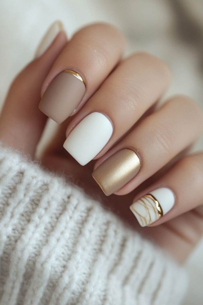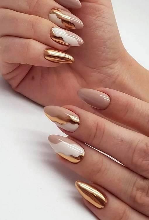 Nude nails highlighted with gold and white accents create a stylish, festive appearance for Fall Wedding Nails For Guests. This mixture fuses softness with sophistication, making it ideal for autumnal festivities. Choose intricate patterns or abstract designs for additional originality.