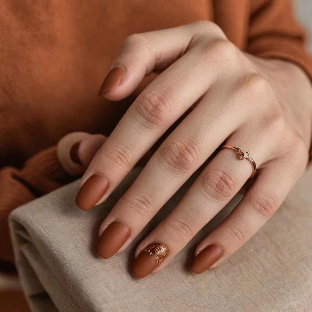Rustic matte nails in natural colors such as olive, terracotta, and beige are ideal for Fall Wedding Nails For Guests. The matte finish enhances their understated elegance, blending effortlessly with autumn-themed weddings. A simple design for stylish, nature-loving guests.