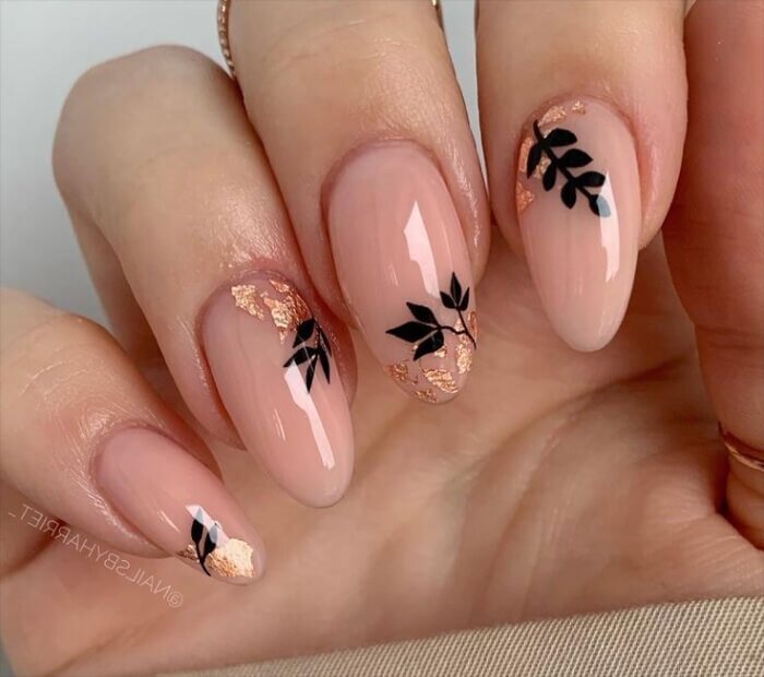 Soft pink nails embellished with intricate gold leaf designs present a whimsical, seasonal aesthetic for Fall Wedding Nails For Guests. This blend radiates sophistication while embracing the natural beauty of autumn. Perfect for outdoor or garden ceremonies, it’s a subtle yet enchanting alternative.
