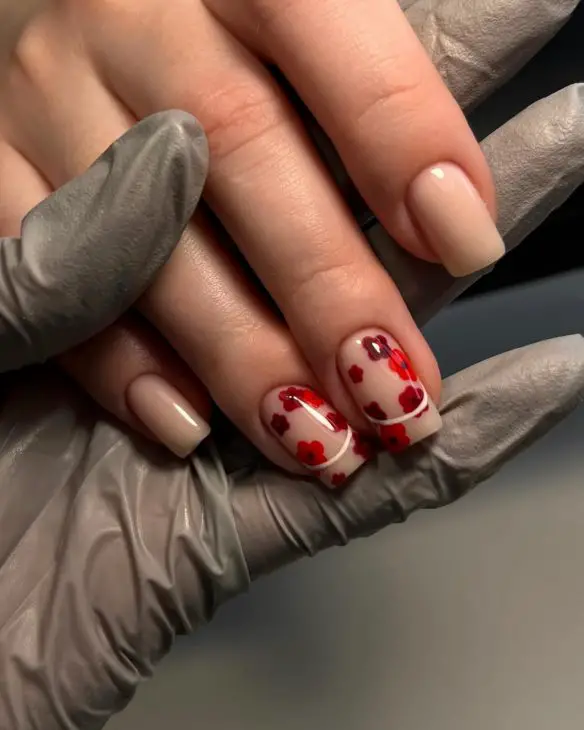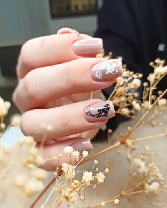 Delicate Floral on Nude introduces a soft and feminine flair to summer square nails. The nude foundation adorned with intricate floral motifs is perfect for a chic and classy look.