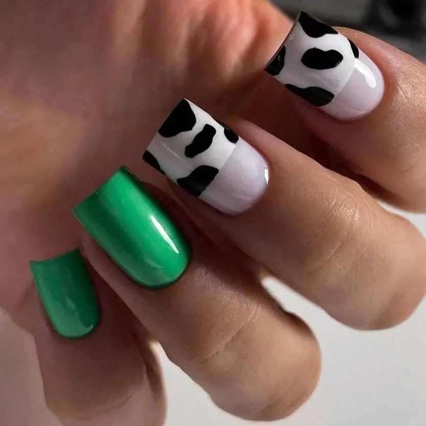 Incorporate a whimsical and distinctive design with Green And Cow Spot Design. The mix of lively green tones and playful cow spot patterns is ideal for a fashionable and striking look.