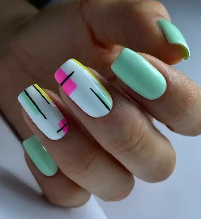 Mint Geometric with White merges refreshing mint tones with crisp white lines for a contemporary summer square nails design. The geometric shapes add a fashionable flair.