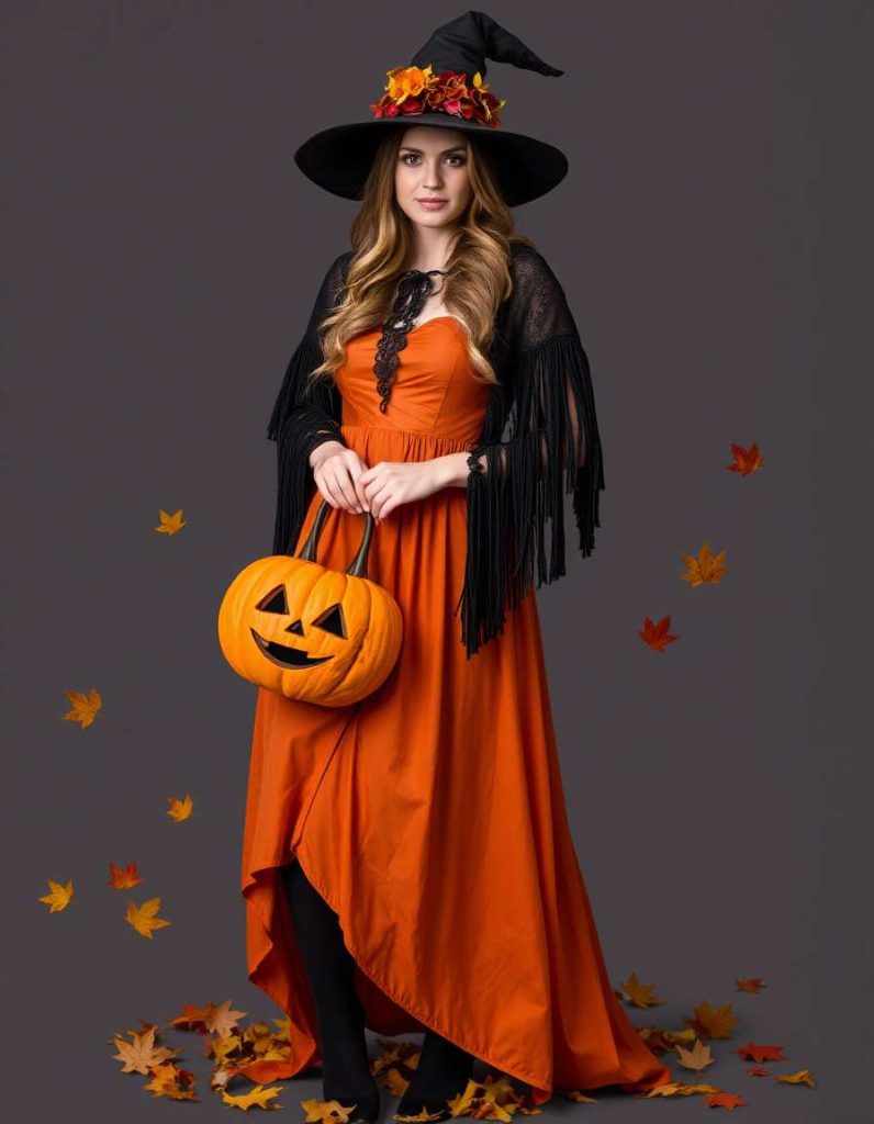 Embrace the spirit of autumn with the witch attire aesthetic, showcasing a burnt-orange frock, dark tights, and a fringed wrap. A pumpkin-shaped handbag adds a whimsical detail, making it ideal for those who cherish the fall season and all its enchanting vibes.