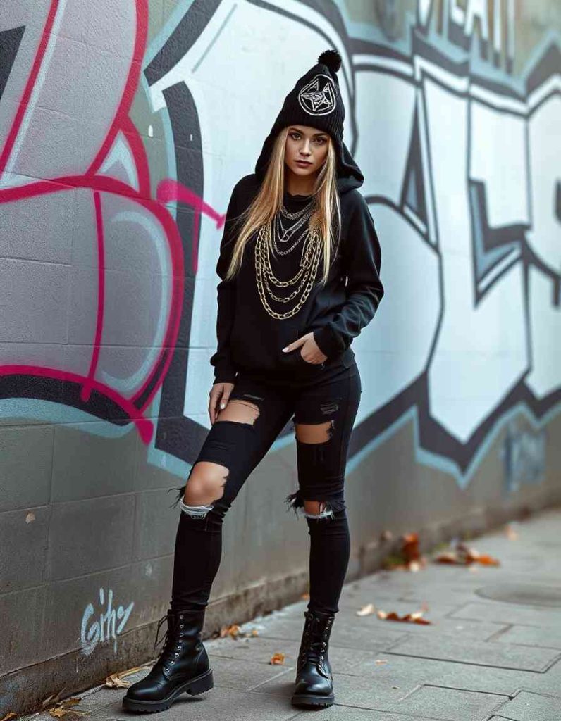 The witch attire aesthetic adopts a contemporary twist with a black hoodie, distressed jeans, and combat footwear. Layered chains and a mystical beanie finalize the street-smart appearance. This ensemble is perfect for witches who embrace city life while keeping a magical flare.
