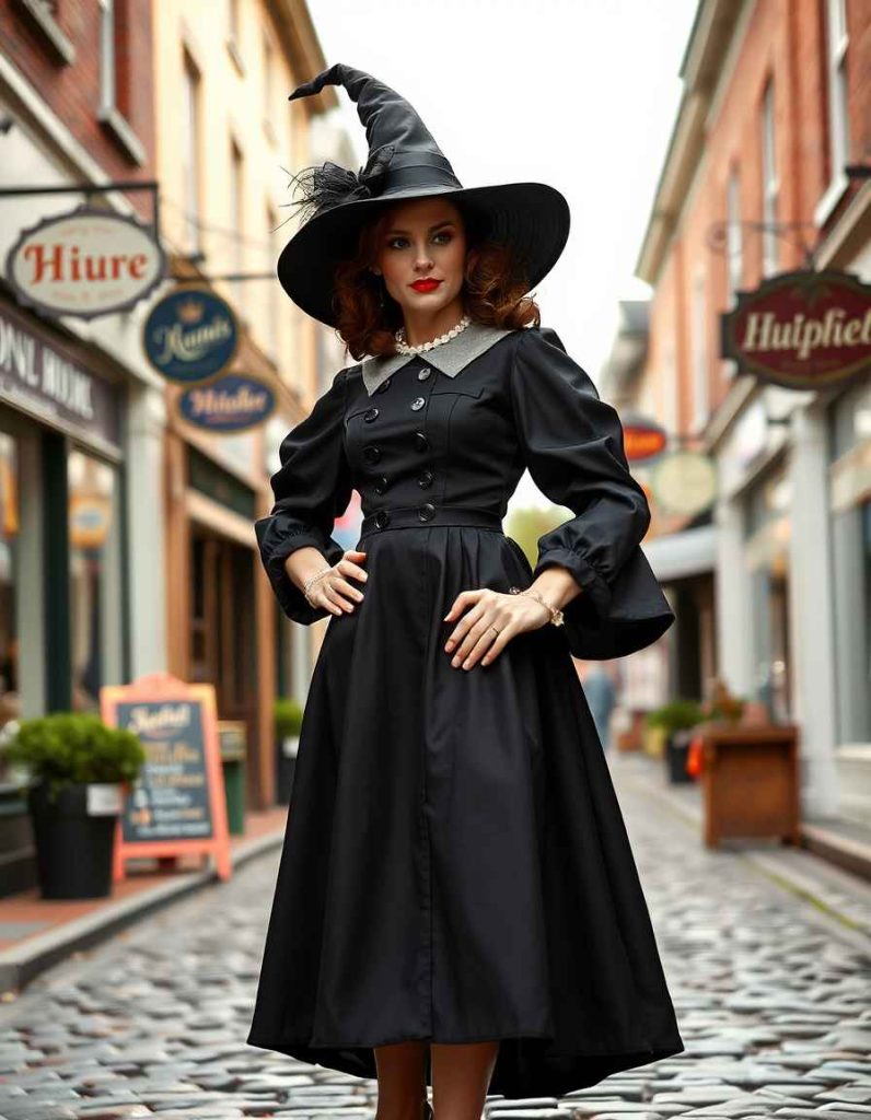 Adopt the witch attire aesthetic with a vintage tea dress inspired by the 1940s. Puffed sleeves and a wide-brimmed hat lend an air of timeless elegance. This delightful look is perfect for those wishing to blend traditional witchcraft with a sense of classic style.