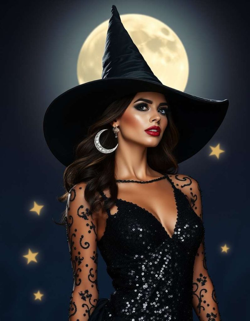 The witch attire aesthetic dazzles with a sparkling black sequin gown and silver crescent moon earrings. This lavish appearance is suitable for those looking to infuse the magic of midnight into their daily fashion, exuding mystery and sophistication.