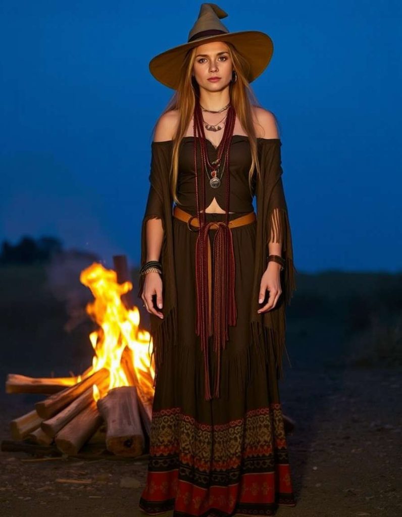 The witch attire aesthetic embraces a bohemian essence with a maxi skirt, off-the-shoulder top, and fringed wrap. This laid-back, mystical vibe is perfect for witches who live a carefree lifestyle while remaining attuned to the magic of the earth.