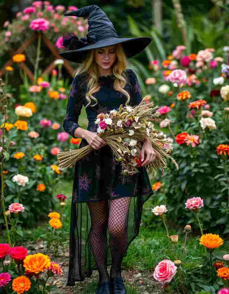 Introduce a hint of nature to the witch attire aesthetic with a black floral gown and sheer lace tights. A bunch of dried blooms completes this appearance, perfect for individuals who merge floral elegance with the mystical charm of witchcraft.